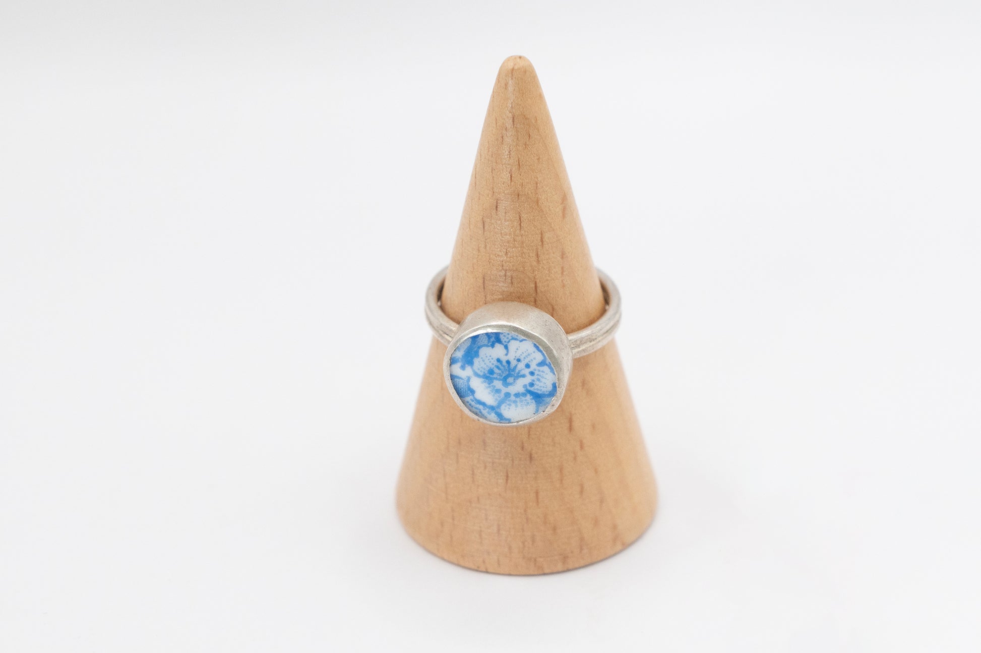 The ceramic in this ring comes from an antique plate, the measurement of the top of the ring is 1.5cm in diameter. The ring and setting is made in sterling silver.