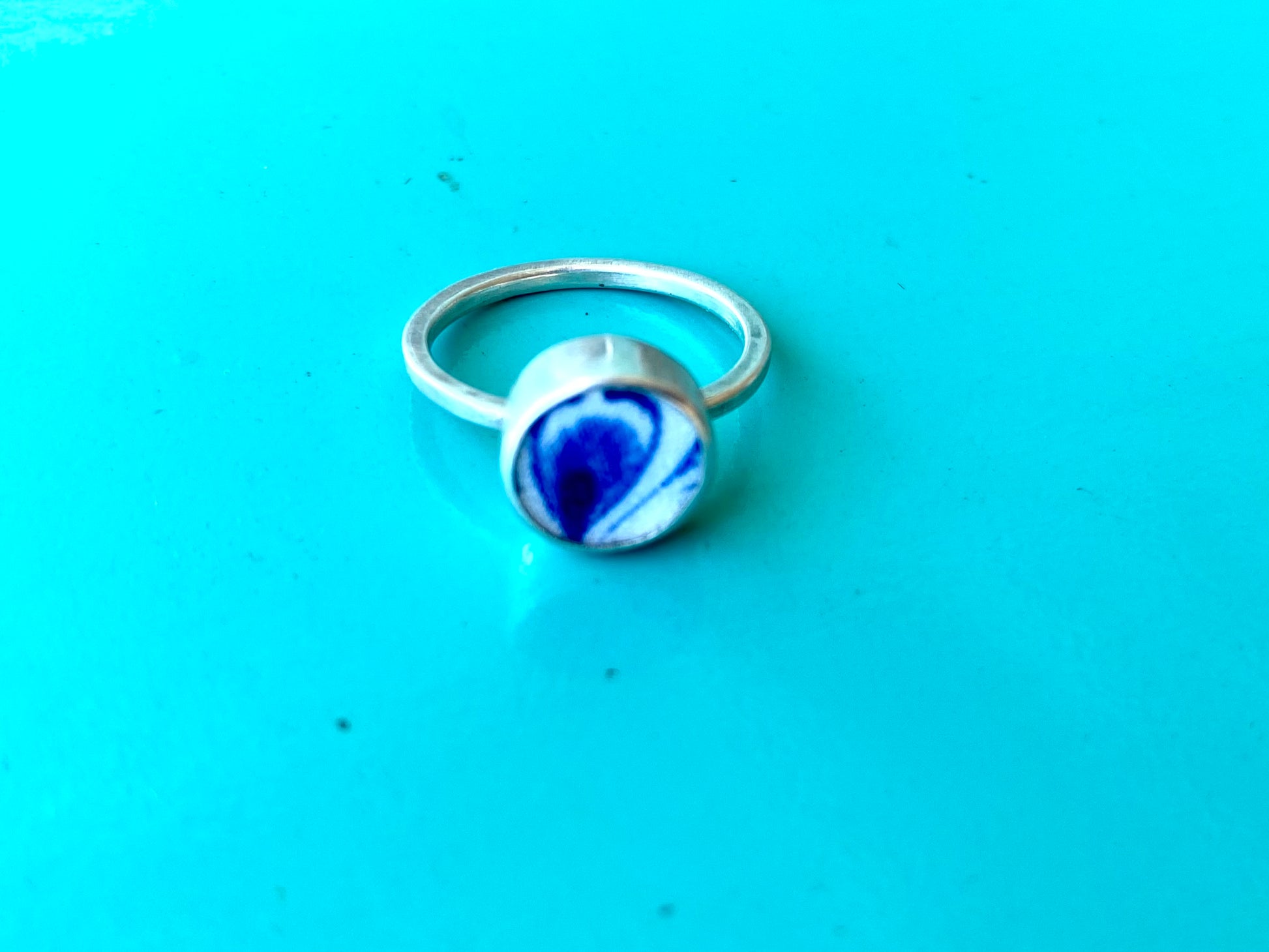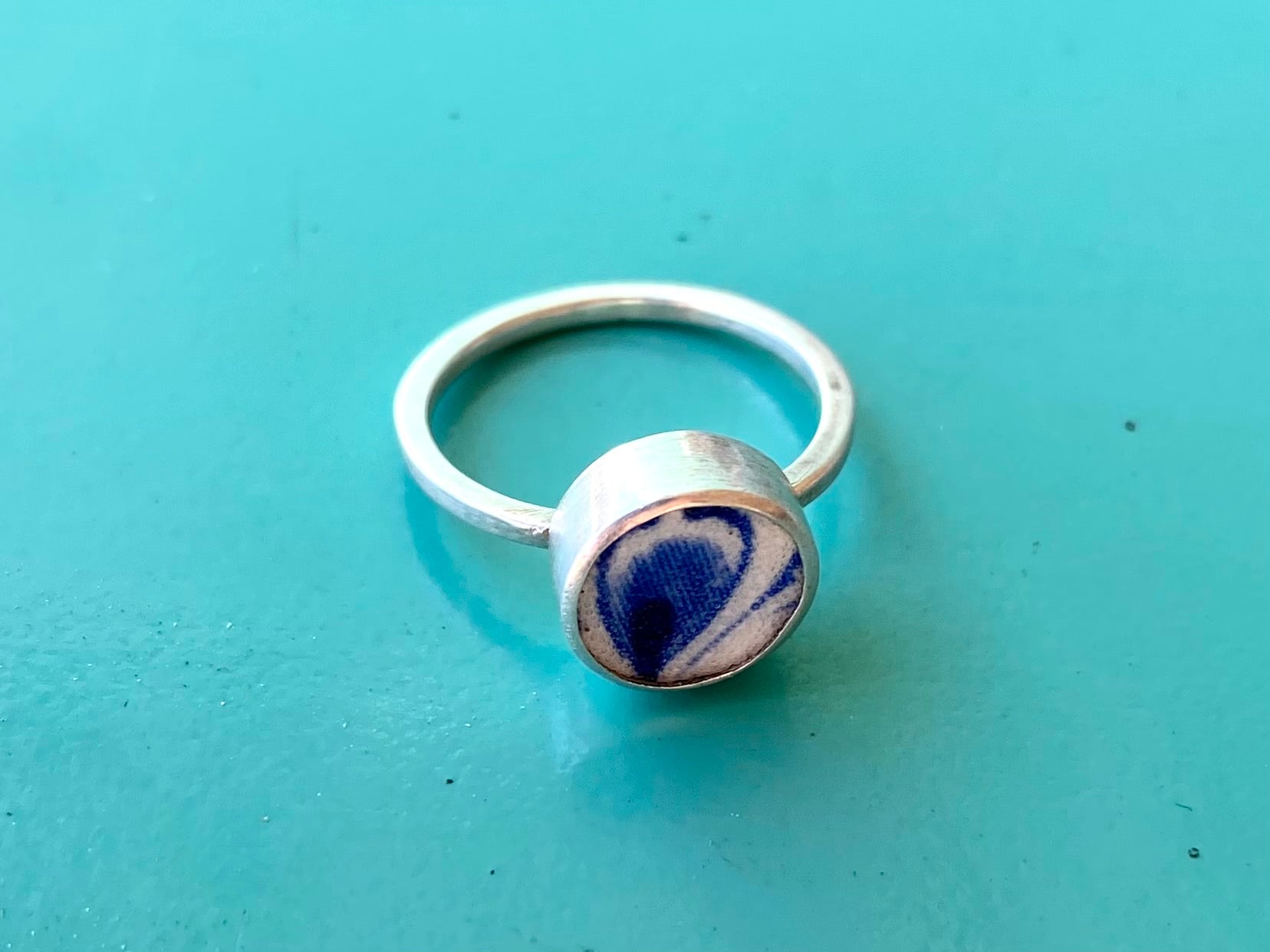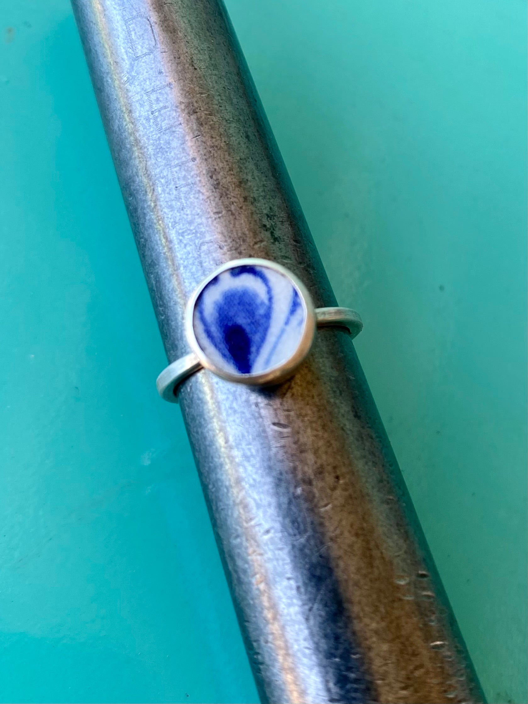 I use ceramic shards from antique plates and shape the ceramic and set them in silver.