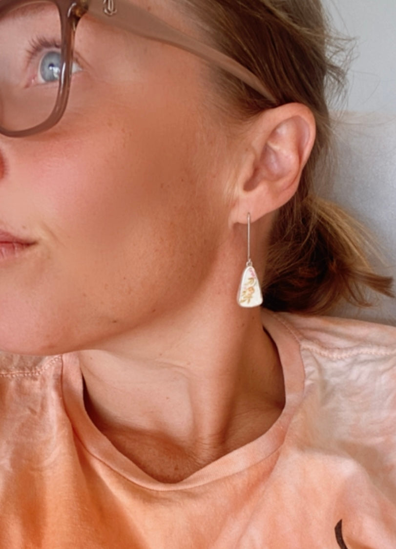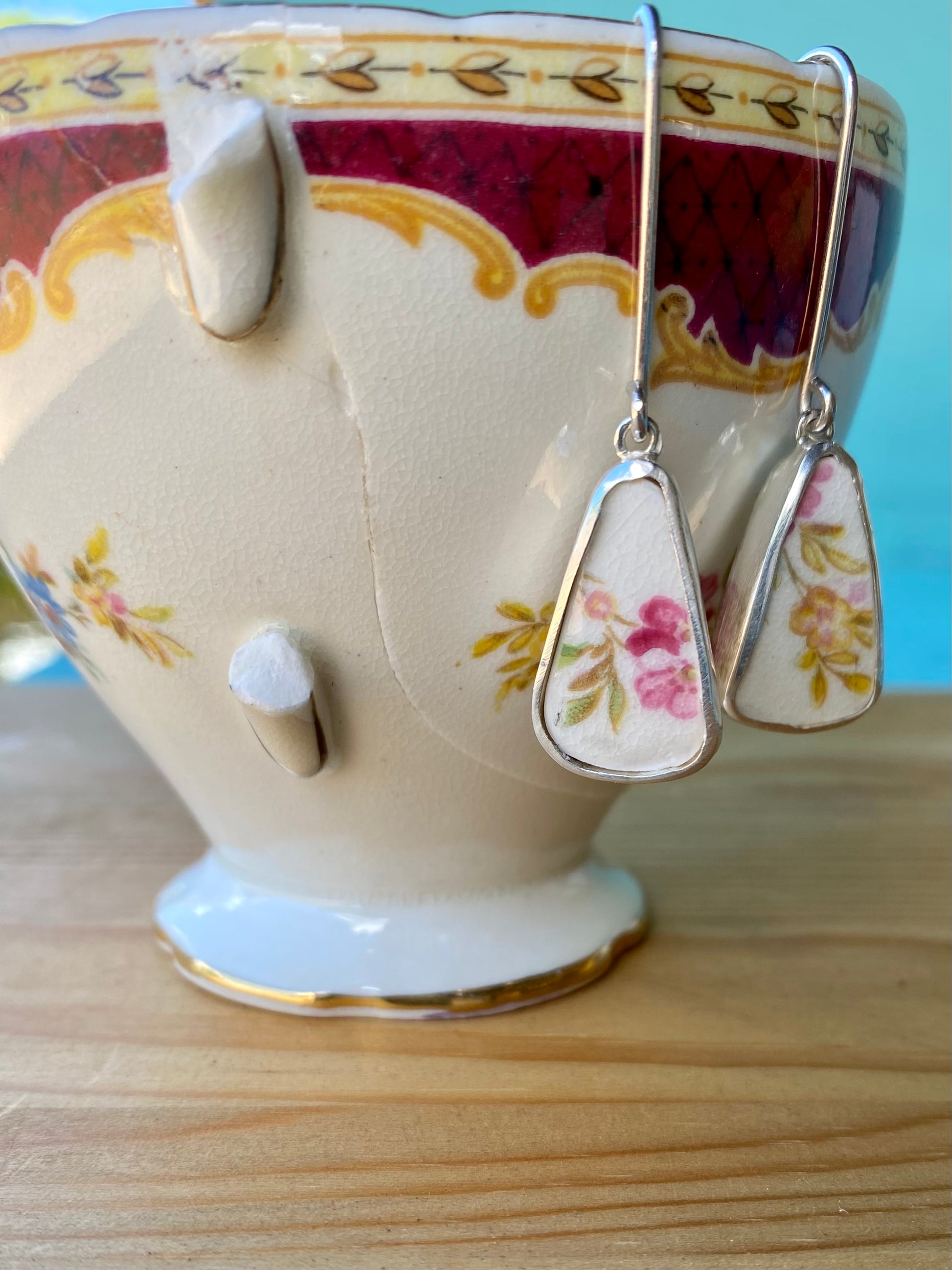 These earrings are made using chine from a tea cup - Tuscan fine English bone china. “Windsor”