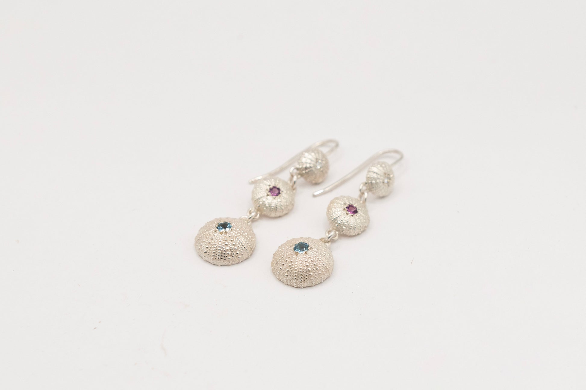 These elegant drop earrings feature a cascading trio of sterling silver sea urchin shells, cast from real urchins to preserve their intricate natural texture. Each shell is delicately set with a sparkling gemstone—Quartz, Rhodolite garnet, and london blue topaz—for a subtle touch of colour and shine.